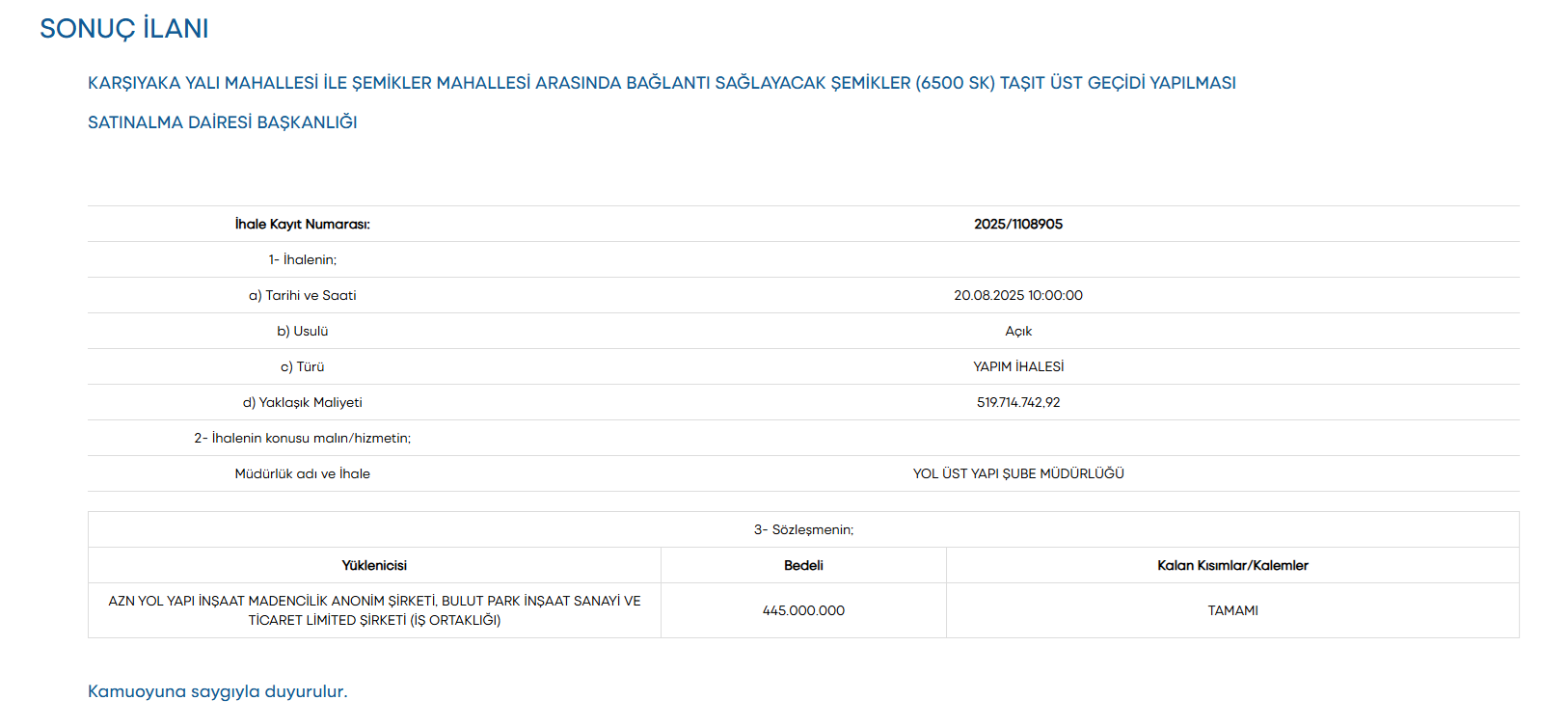 Karşıyaka'nın en kritik ulaşım hamlesi için düğmeye basıldı. Yalı Mahallesi ile Şemikler Mahallesi arasında kesintisiz bağlantı sağlayacak olan taşıt üst geçidi ve bağlantı yolları projesinin ihalesi 445 milyon TL bedelle sonuçlandı. Kamulaştırma işlemleri tamamlanan bu dev yatırımın, bölgedeki trafik yoğunluğunu ciddi ölçüde azaltarak 360 gün içinde hizmete açılması hedefleniyor.